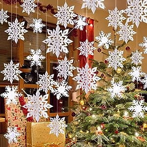 Valuable Pack: Valuable Pack: 24pcs 3D Glittery Large White Hanging Snowflake & 2*12 pieces 3D snowflakes in a string. Just fold along the sewing seam to get 3D snowflakes!