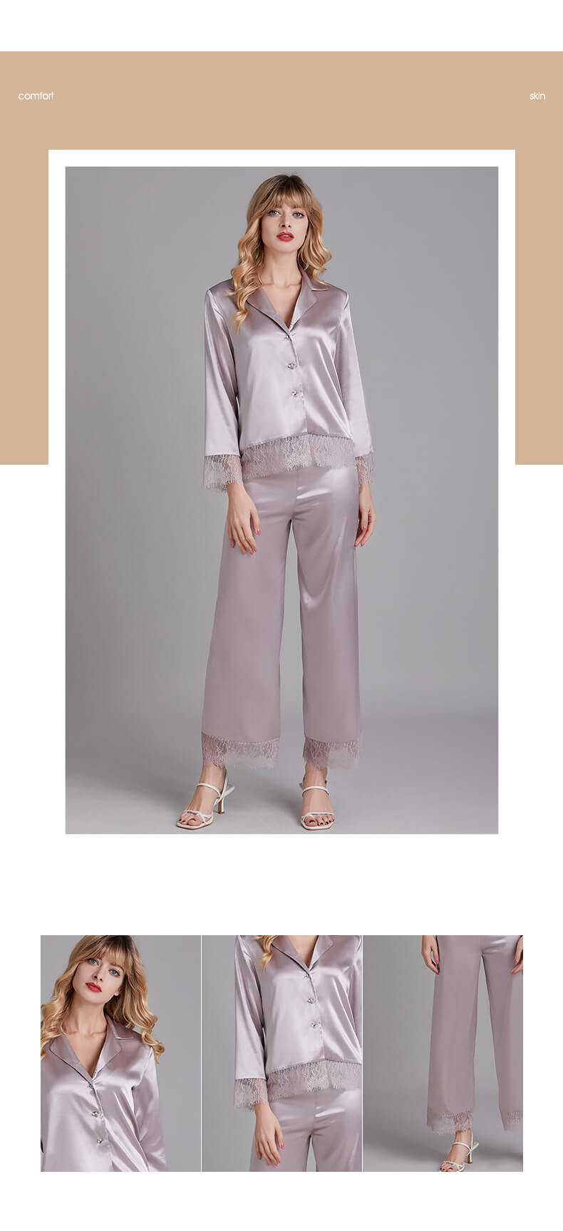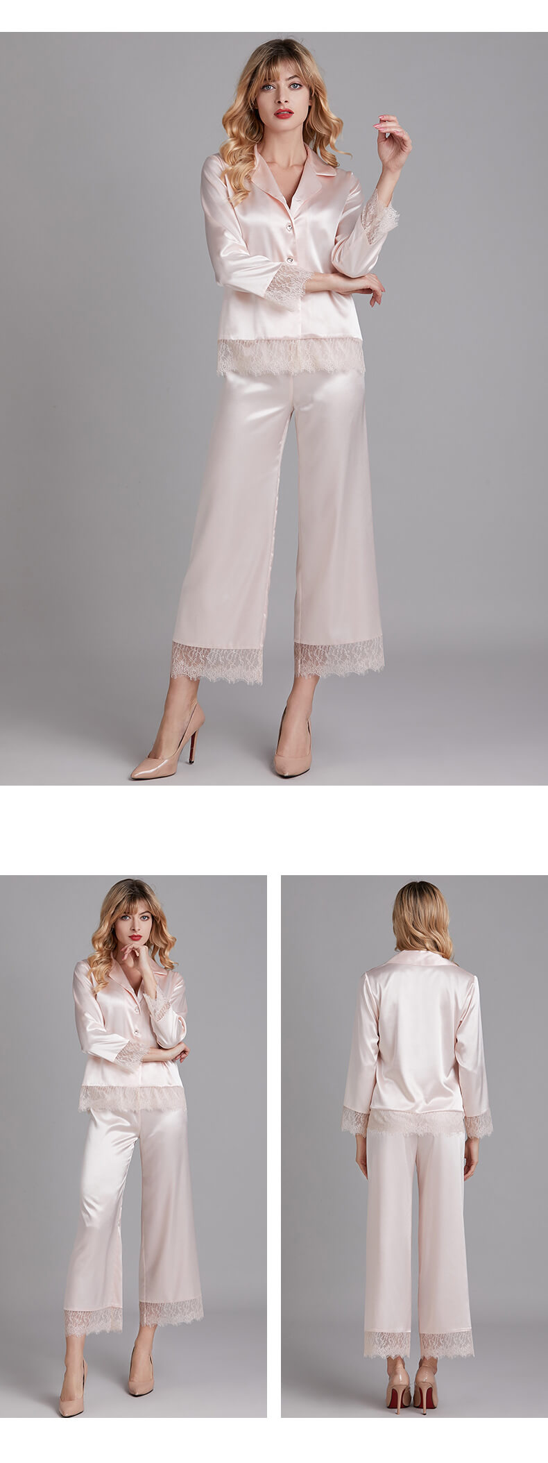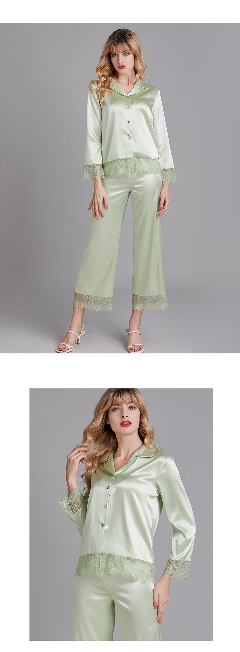 Type: PajamasMain Material: Polyester, satinThickness: ThinGender: WomenAge Group: 18 - 40Package Includes: Top * 1, pants * 1Seasons: Spring, summer, autumnOccasions: Sleeping, living at home