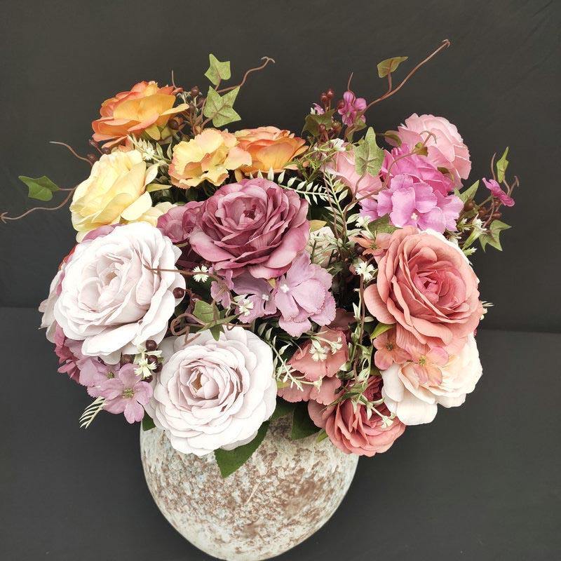 A bunch of flowers consists of about 4 flowers, and each with 7 flowers heads, 2 hydrangeas, 2 bunches of small flowers. Best Gift for your family, mother,wife, girlfriend and sister....